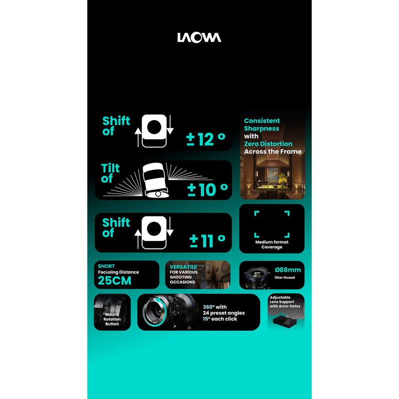 Combining an ultrawide 17mm focal length with precise perspective and focus plane control, the Laowa 17mm f/4 Zero-D Tilt-Shift Lens from Venus Optics is designed for medium format Hasselblad X-mount cameras and applications that demand architectural accuracy. Its ±8mm shift capability allows photographers to correct converging vertical lines directly in-camera, while the ±10° tilt adjustment enables manipulation of the focus plane for expanded depth-of-field control or creative miniature-style effects. The lens provides a broad 104° angle of view while Laowa's Zero-D optical design minimizes distortion at the source, producing clean, natural geometry across the frame.