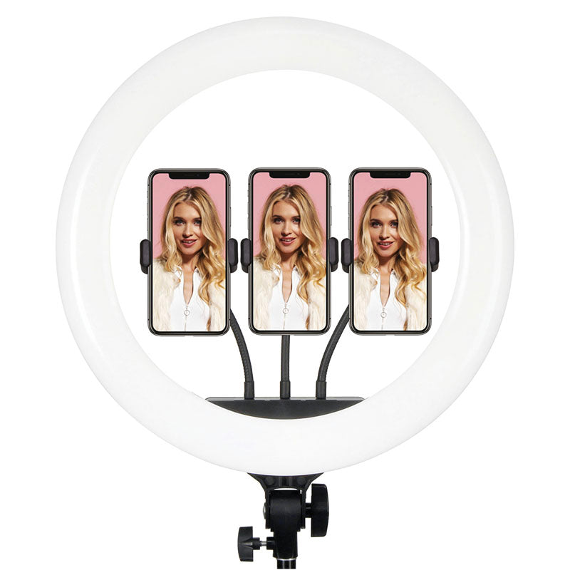 - 3 cold shoe mounts on the ring light to attach accessories such as microphones or teleprompters using included cold shoe ball head