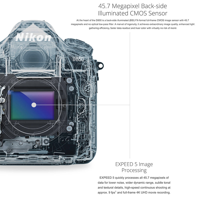 At the heart of the D850 is a back-side illuminated (BSI) FX-format full-frame CMOS image sensor with 45.7 megapixels and no optical low-pass filter. A marvel of ingenuity, it achieves extraordinary image quality, enhanced light gathering efficiency, faster data readout and truer color with virtually no risk of moiré