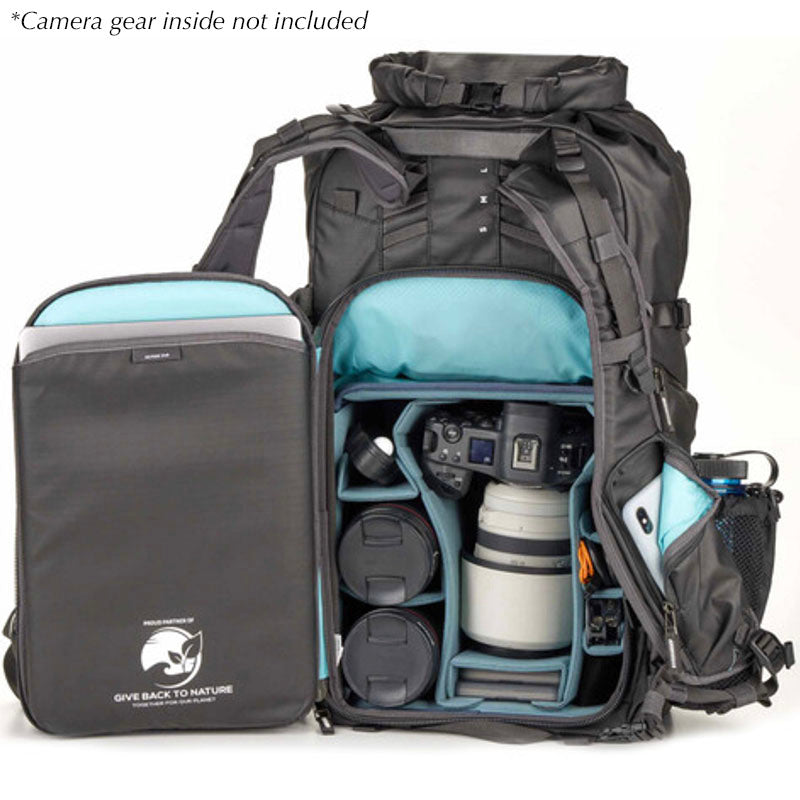 The Action X25, X30, X40 and X50 feature side camera access and two removable tripod or water bottle pouches that can be moved to the belt location for instant access to key accessories like snacks and lenses, or removed completely to save weight. Two padded sleeves protect laptops and tablets up to 16 inches. Finally, the removable belt, luggage-handle pass-through and hidden AirTag sleeve make the Action X40 a stealthy and stylish partner in urban and travel environments. If you need to carry a gripped camera body and still want a relatively small pack, this is the one for you. *This Starter Kit includes an Action X40 Backpack, Medium DSLR Core Unit v2, Helmet Holder and Rain Cover.