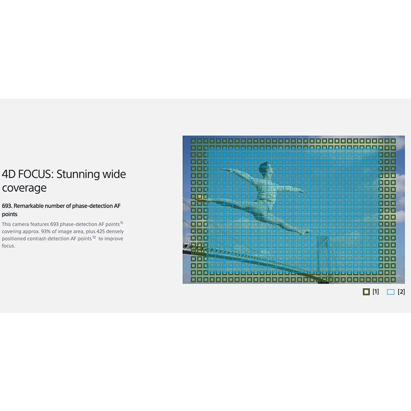 This Camera features 693 phase-detection AF points covering approx. 93% of image area, plus 425 densely positioned contrast-detection AF points to improve focus.