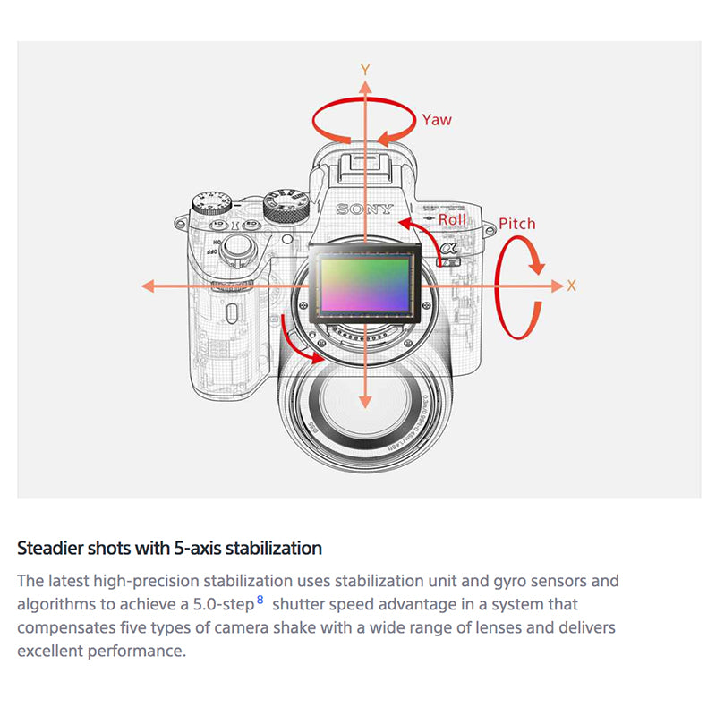 It also features a fast continuous shooting at up to 10 fps at full resolution, for up to 177 consecutive frames, and with full-time AF/AE when working with either a mechanical shutter or an electronic shutter. If shooting in live view mode, a continuous shooting rate of up to 8 fps is also possible. Packed into the robust a7 III, is a 5-stop effective 5-axis SteadyShot INSIDE image stabilization system that compensates for five different types of camera shake encountered during handheld shooting of stills and video. This allows users to confidently use any lens, even adapted lenses, for critical imaging without encountering blur from camera shake.