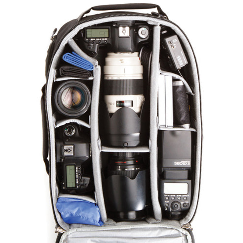 Enjoy integrated, quick access pockets for both a laptop and iPad, a top pocket for boarding passes and three robust handles, ensuring easy placement/retrieval from overhead bins. The light, adjustable, contoured harness provides comfort along with lumbar support and air mesh paneling to keep your back cool. The height adjustable sternum strap allows for the perfect fit. A removable waist belt, side water bottle pocket, tripod/monopod mounting system and seam sealed rain cover extend the versatility of this line. For increased functionality, these backpacks can be used with our Pro Speed belts for additional support and they're fully compatible with our Modular Component line for even greater capacity.
