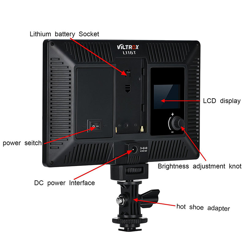 Viltrox L116T LED light adpots newest LED honeycomb design. It has high brightness, nature and soft light, stable color temperature. The High definition LCD display let the operation interface clear. You can adjust the brightness and color temperature steplessly. It's suitable for portrait, childrend wedding etc. The hot shoe is made out of durable metal baseboard and it can be mounted on DSLR, Video Cameras, and Tripod/Monopod